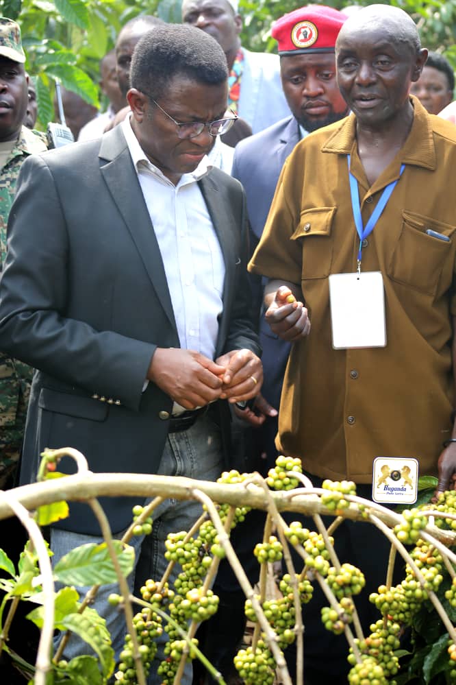 Katikkiro Charles Peter Mayiga bw’abadde alambula abalimi b’emmwanyi mu ssaza Ssingo mu ggombolola Musaale Bulera, asinzidde eno n’atongozza omwaka gwa Mmwanyi Terimba 2025/2026 A.